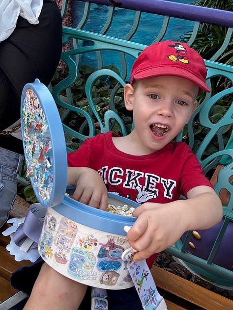One of the most memorable and unexpected joys of Tokyo Disney is the popcorn. You buy special buckets and then refill them with different flavors scattered throughout the park, something we did without a second thought about sugar content or moderation. Flavors like caramel, soy sauce and butter, curry, milk chocolate, strawberry, and honey are everywhere, and Dax was completely in love.